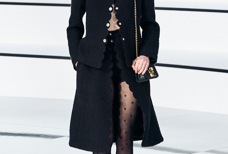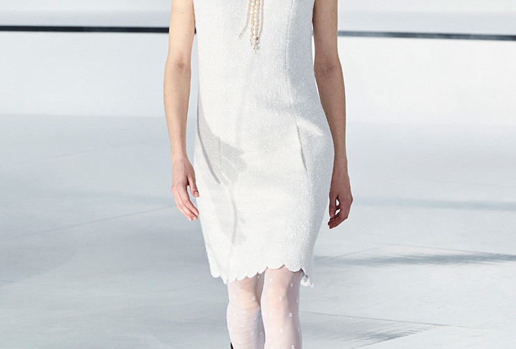 В новую коллекцию вошли: твидовые жакеты, юбки, жемчуг, новые варианты классических сумок, белоснежные рубашки с пышными рукавами, перьями и золотыми цепями, брюки с разрезами по бокам, сапоги с широкими контрастными отворотами, словно у мушкетера.