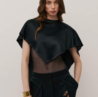 До капсули увійшли бавовняний костюм-трійка з жакетом, корсетом і мінішортами, куртка-балон і драпірована спідниця з нейлону, сатинові сети: топ з брюками та кейп зі спідницею, шифонова блуза, напівпрозоре боді та сукня зі шлейфом. Палітра витримана у білих, молочних, масляних і чорних відтінках, формуючи м’який контраст між тілесністю й структурністю, між світлом і тінню