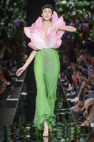 Очередное яркое творение Джереми Скотта: на показе Moschino дизайнер нарядил моделей в бабочек, цветочные лужайки и цветочные букеты. Платья имитировали то цветочную обертку, то бутон лилии, то целую поляну. По словам дизайнера, тема коллекции ─ двойственность. Поэтому пачки (которых "ух" как много) он предлагает носить с косухами с металлическими заклепками ─ многие из них укорочены, так что полностью открывают живот.