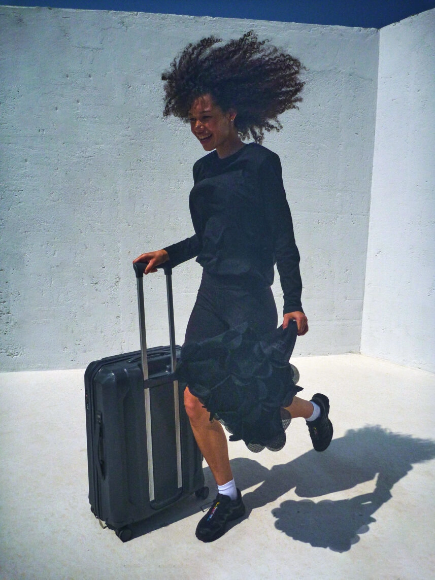 Флагман колекції, об’ємна чорна сумка, зібрана вручну з 175 гексагональних елементів за принципом футбольного м’яча. Вона оснащена зовнішніми стропами для йога-килимка, внутрішньою кишенею і йде в парі з окремою косметичкою. Її геометрична точність і м’які форми створюють сучасний силует – ідеальний для подорожей, міських прогулянок чи тренувань