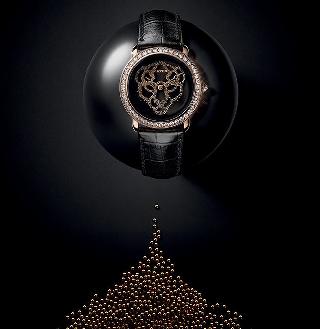 Cartier представили новые часы Révélation d'une Panthère. На их циферблате творятся чудеса: 900 крошечных золотых сфер, плавно перекатываясь под стеклом циферблата под воздействием гравитации, складываются в суровый лик главного тотема Cartier — пантеры.